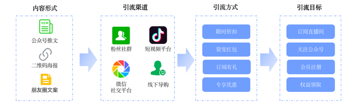 时下非常流行的品牌线上直播,可以通过导购去做预热,吸引消费者到线上直播间观看,从而产生购买和交易行为。除此之外,通过一些引流的方式,除了观看直播外,同样能够去吸引用户去订阅直播间、关注公众号、注册会员等。