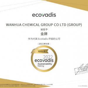 2022年10月10日,经欧盟EcoVadis审核认证,万华化学在其全球性企业社会责任(ESG)评估中首次突破70分,再次荣获金牌认证勋章,该得分在EcoVadis评估的全球75000多家参评企业中位列前5%。