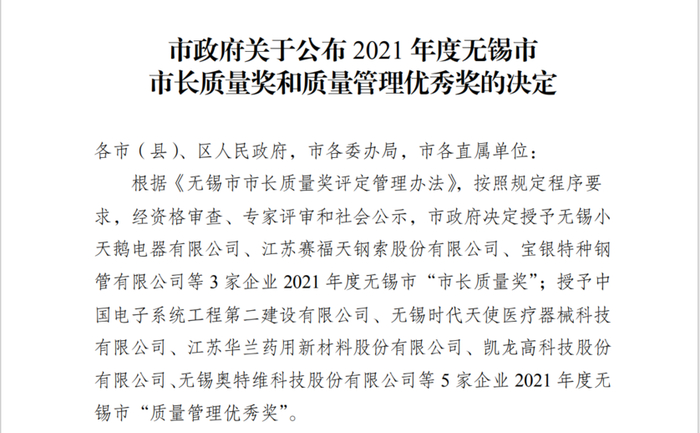 近年来,无锡市相关部门积极推进落实质量强市建设,加大了市长质量奖的培育力度,积极组织、动员优秀企业参评。通过优秀企业的参评,引导和带动广大企业“重视质量、追求质量”,有力传承和诠释了“百年锡商,至诚卓越”的城市质量精神,广泛宣传、大力推崇了企业家精神和工匠精神,激励引导全市各行业加强质量管理,深入实施质量提升行动,促进各领域质量供给水平的提升,为产业链上下游企业学习建立质量标杆提供了有力的政策支撑,推进了各行业质量的提升。凭借个性化定制的质量管理模式的有效运行,以及在政府部门的支持下,赛福天成功获评“2021年无锡市市长质量奖”。