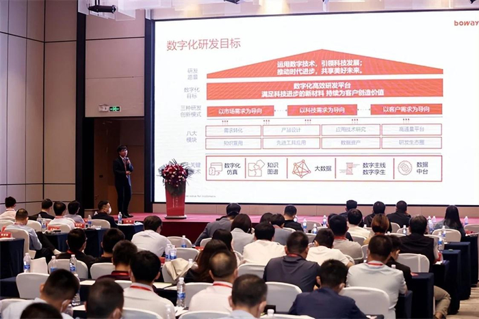 博威研发总监孟总重点阐释了博威如何通过数字化技术,提升研发效率,满足市场需求的路径。博威合金结合数字化前沿技术的发展,打造了高效的智能新材料研发平台,以计算仿真、大数据分析、知识图谱、数字孪生、数据中台云计算等数字化新技术,赋能材料研发全周期流程,有效促进了产业链上下游的协同创新发展。博威合金以数字化打通了研发与产业化的信息孤岛,解决了当前有色合金新材料研发的最大瓶颈,实现了“研发、制造一体化”。