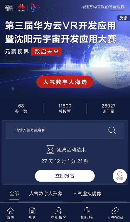 由沈阳市和平区人民政府、华为技术有限公司共同主办的“第三届华为云VR开发应用暨沈阳元宇宙开发应用大赛”已经于9月28日正式启动。本届大赛以“元聚视界 数启未来”为主题,自报名通道开放以来,已经吸引了大量优秀的团队与项目报名参赛。其中最值得一提的是,本届大赛新设立“人气数字人形象奖”与“人气虚拟偶像奖”在海选开放不久就已吸引了68个数字人项目报名参赛,参与海选投票的人数近1万2千人,且还在持续增长中。