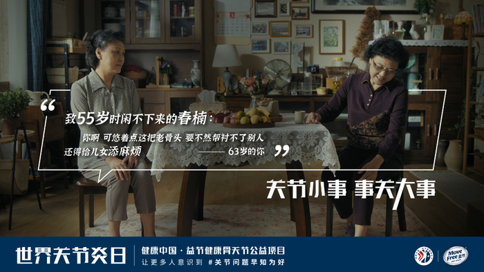 为了更好地向大众传递出“关节小事,事关大事”,活动特别推出「健康中国 · 益节健康骨关节公益项目」宣传短片,同时也得到了中国家庭医生、三联生活周刊、观察者网等多家媒体平台的同步宣传支持。在短片中,两位主角分别对年轻时的自己发出忠告,告诫过去的自己及早重视关节问题,切勿因忽视关节让未来的幸福频频受阻。通过极具真实感的讲述,在情感上撬动消费者引发共鸣,引起全社会对关节炎的广泛关注与重视。