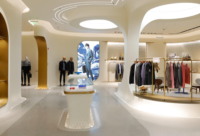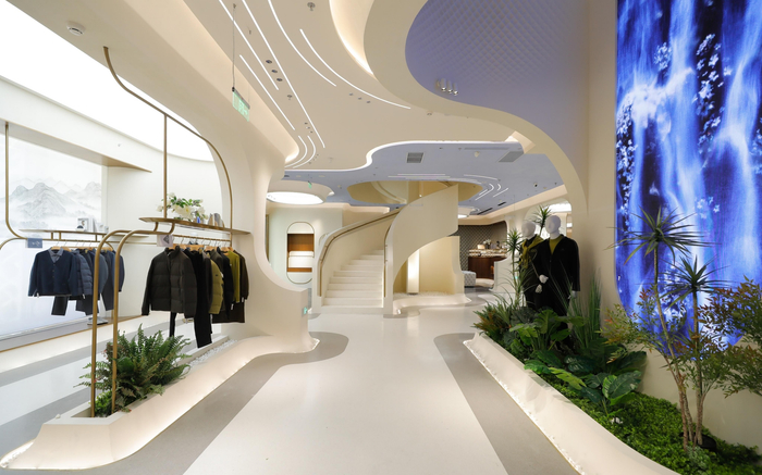 在正门主入口处,“万花筒”艺术品将GORNIA的品牌标志转换为不断变形渐进的结构体,流光溢彩的万花筒象征着品牌的不断演进。同样引人瞩目的还有名为“裁素悬天”的数字化瀑布,数以亿计的水粒子从高处垂落,与虚拟构建的山石碰撞,融合成壮美的瀑布,如同悬挂的丝绸一般倾斜而下。旗舰店融合了艺术与科技,让空间更具流动性,体验更具层次感。