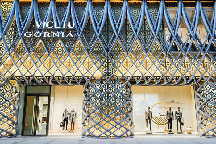 旗舰店外立面错落有致的空间形态,是由一个个代表VICUTU的“V”字编织交错而成。简洁的线条勾勒出整齐的序列感,层层叠加,营造出极富张力的视觉效果。“V”形编织体系的创意源于自然界的根系,寓意“生生不息”,象征着VICUTU威可多品牌日新月异、勇于开拓的创新精神。