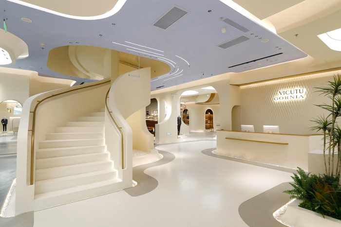 旗舰店共分为上下两层,依次陈列着VICUTU威可多红标、VICUTU威可多蓝标以及GORNIA格罗尼雅品牌服装,空间设计极具透光感与雕塑结构,动感的天光造型可以引导顾客进入不同的展示区域,予人轻松愉悦的视觉体验。