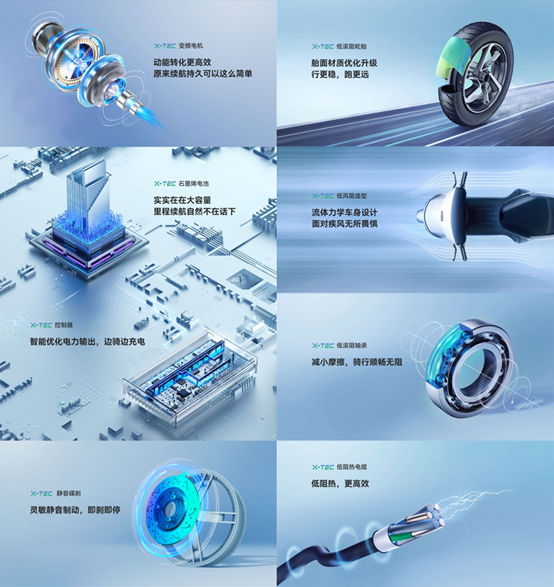 新日X-TEC远航双核系统的“双核”,即为由高效率变频电机、大容量石墨烯电池、支持边走边充的智能控制器、超灵敏静音碟刹组成的“动能核”,以及由低滚阻轮胎、低风阻造型、低滚阻轴承和低阻热电缆组成的“节能核”,可以在不改变动力的前提下,达到“节省能量损耗,精准高效控制能量输出,大幅提升续航里程”的目的。