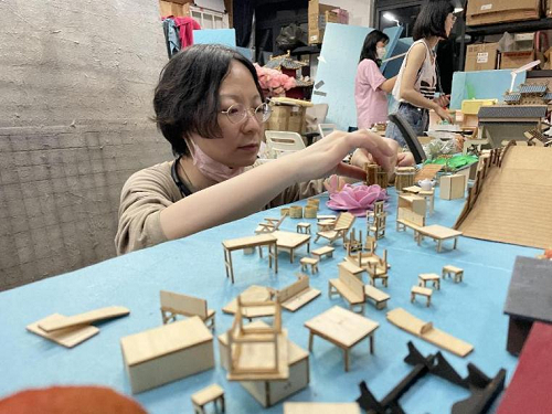 (周伟在筹备广告道具排布工作)