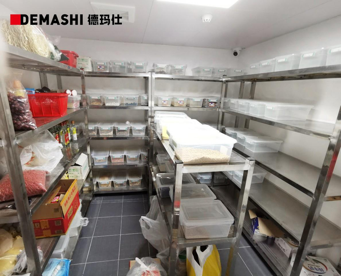 除此之外,工程师直接将热厨区的另一边设计成储物间,让不起眼的狭小空间也有了用武之地。“山”字型的摆放,既留有充足的通道便于后厨人员行动,也让储物间的摆放井井有条,整理和归纳更便捷。同时,独立开来的储物间,可以躲避厨房中多油多水的环境,让食材在干燥、有利的条件下贮存。