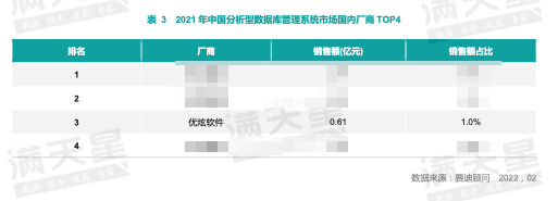 据赛迪顾问发布《2021-2022年中国平台软件市场研究年度报告》,优炫数据库市场份额在事务型数据库和分析型数据库细分领域均排名第三,持续位居中国数据库管理系统市场国内数据库厂商前列。