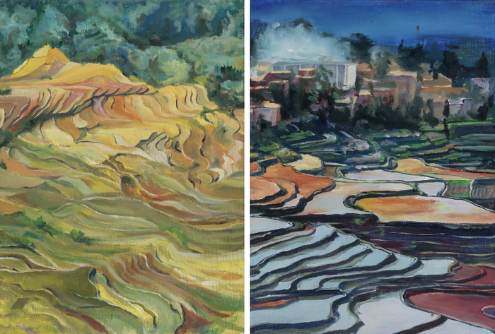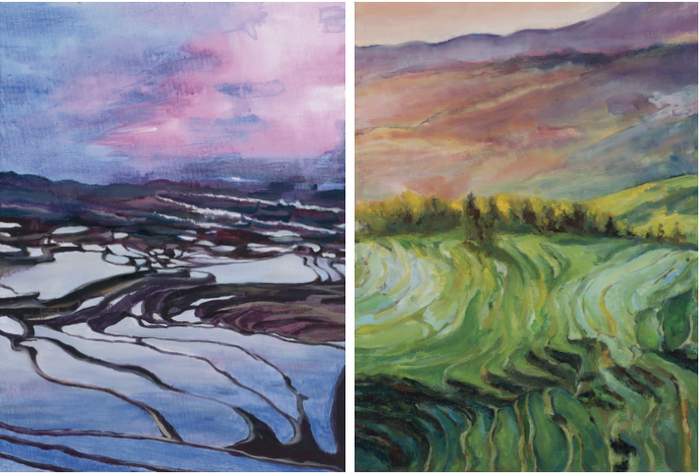 元阳梯田所蕴含的精密复杂的农耕体系和人与自然和谐相处的生存智慧得到了世人的高度赞扬,其特有的森林、村寨、梯田、水系“四素同构”循环生态系统,高原农耕技术及生产、生活、文化相融共生的活态文化系统,充分体现了“天人合一”的文化内涵,是哈尼等各族先民农耕文明的智慧结晶和农业文明文化景观的杰出范例。作为著名潮流艺术家及中国地域IP领域传播传统文化的先行者,徐明此次创作的《一山四季》系列作品,以哈尼族历法为依托,通过油画形式传递元阳梯田山暖、朝雨、岁收、翠寒四季美景,描绘了哈尼历中二到四月的春日山暖、生灵苏醒,六到八月朝雨过后、日出时分朝霞映梯田的青翠,哈尼“十月年”节日期间水稻成熟、漫山金秋的丰收喜悦,以及十到十二月梯田蓝、橙、红等丰富的色彩,呈现了梯田最美的季节。