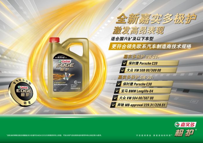 百年润滑油专家嘉实多一直走在润滑油行业前端,凭借着先锋精神和创新科技实现了一次次的突破,对产品进行不断的创新升级。今年9月嘉实多中国再度重磅推新,推出极护超豪欧系系列以及磁护OW-20产品,持续追求创造行业新高度!新品不仅适合国六b1及以下车型,更是专为欧系/亚系车型研发2,满足当代发动机的需求以及行业和全球领先汽车制造商的技术规格要求。