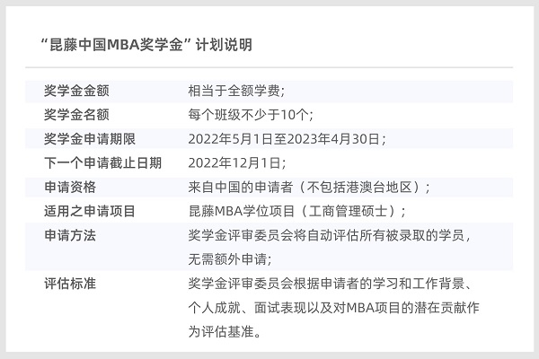 即刻加入我们,成为更好的自己!关注昆藤官网或微信公众号,了解更多关于“昆藤中国MBA奖学金”计划详情!