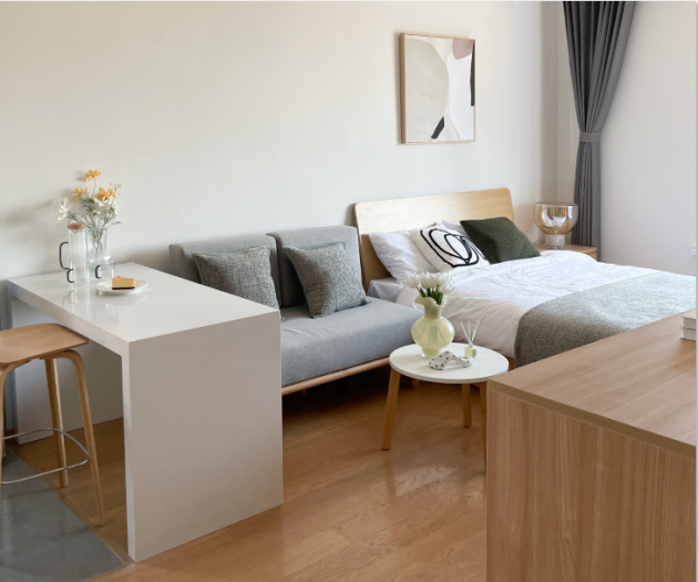 泊青轩(海客公寓)整体设计基于精致小户型的建筑空间,扩展“户外大HOUSE”的景观空间,演绎现代年轻化圈层社区,开启时尚、小资、艺术的活力之旅。样子生活考虑到人生阶段的不同居住需求,以”实用美学主义“为设计理念,将极简与自然、硬朗与现代渗透融合,独享开间、松弛一居、宽敞两居、共享宿舍四种户型内都秉承简洁、实用而展开,为居住体验带来全新升级,打造轻松自在的家。