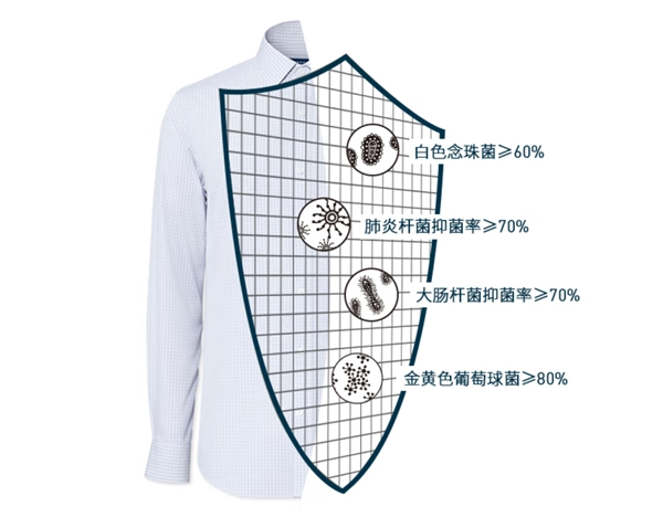 针对细菌问题,十如仕创新研发了AAA级抗菌技术,通过杀死引起异味的细菌,从而减少衬衫散发异味。抗微生物技术处理,让衬衫即使经过30次清洗,仍能杀死 90% 的测试微生物,减少细菌对肌肤的伤害,呵护敏感肌肤。