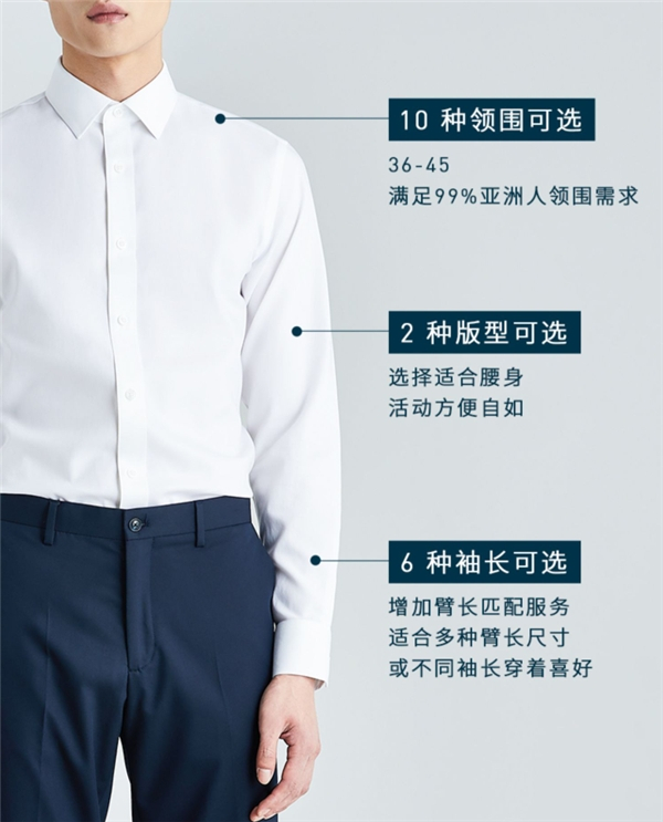男士买衬衫时,常常为选不到合适的尺码而困扰,十如仕的商务免烫衬衫,创新性地推出了61个精准尺码,包含领围,袖长,版型三个维度。过去需要大几千块、花半个月定制衬衫才能享受到的合身和高品质,此刻无需等待便能够轻松拥有。