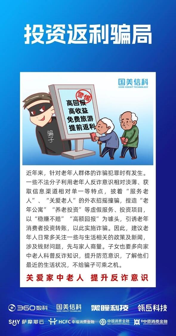 当前,针对老年群体的电信网络诈骗案件频发,因其诈骗犯罪性质恶劣、侵害对象特殊、追赃挽损难度大,严重侵害了老年群体的合法权益,给老年人造成经济损失和精神痛苦,严重影响身心健康和家庭和谐。为进一步提高老年人识骗防骗能力,本次互联网及金融反诈联盟联合国美信科等企业,根据当下针对老年人的高发电信网络诈骗类型,总结梳理出了“投资返利”、“冒充亲人”、“保健品”、“冒充公检法”、“免费旅游”、“以房养老”、“社保代理”及“中奖”共八类典型骗局,科普养老诈骗防范指南,切实维护老年人合法权益。