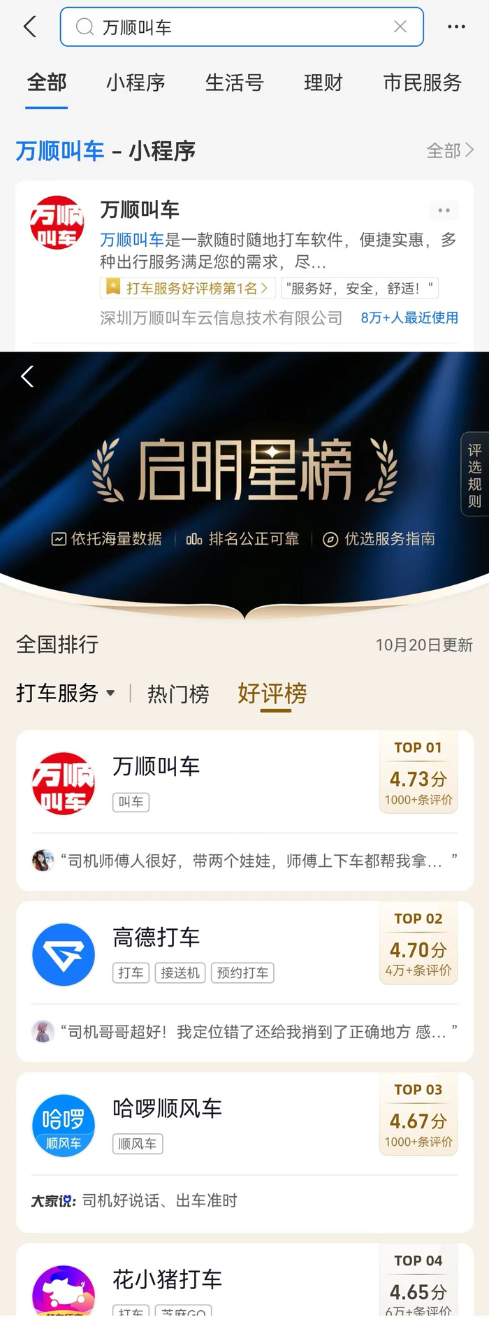 万顺叫车登上支付宝“启明星”好评榜第一名