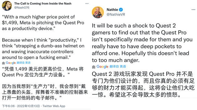 “凭借1499美元的更高价位,Meta将Quest Pro定位为生产力设备。当我想到’生产力‘时,我会想到戴上愚蠢的头盔,挥舞着不准确的控制器来打开一封电子邮件。”一海外网友在Twitter上吐槽道。