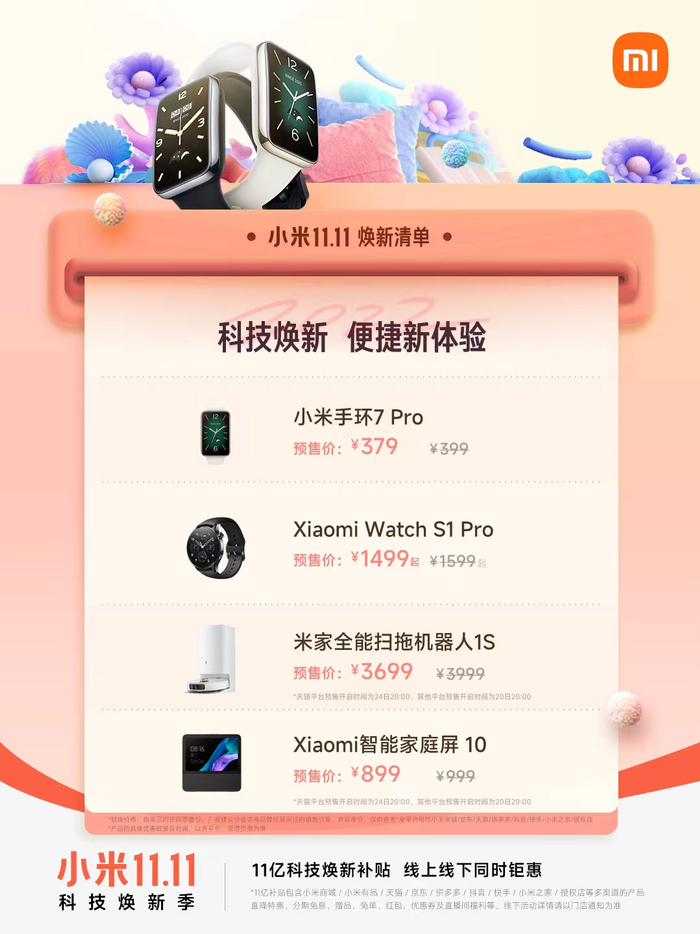 除了以上产品外,还有诸多产品让利降价,为消费者提供更好的科技生活。同时,小米新零售体系也在此期间推出多种应季特惠福利,在小米商城、小米之家同样享受以上小米双十一政策优惠。与此同时,小米之家门店已入驻京东到家、美团及饿了么等多家线上即时零售平台,消费者可以享受双十一足不出户、线上下单、门店商品现货小时甚至分钟级送达的便捷服务。从10月20日20点开始,小米双十一全平台开启预售,11亿超狠补贴钜惠,可谓诚意十足,以最实惠的价格为消费者打造最火爆的狂欢节盛典,喜欢的朋友一定不能错过。