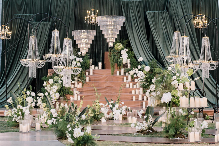 复古水晶吊灯、墨绿色帷幔,配上淡雅的白色花束,眼前的这幅场景,让宾客们仿佛置身梦幻的森林庄园,亲身体验一场森系的屋顶户外婚礼。一场完美的婚礼要想办得有仪式感,一个浪漫的婚宴场地必不可少!武汉宴·樽庭,为武汉光谷高新之地,青年才俊佳人筑甜蜜殿堂,为光谷东的爱情故事,增雅仪之景。