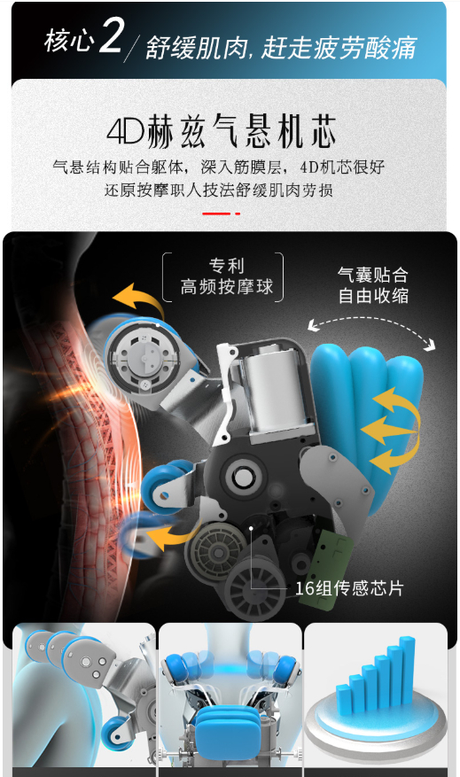 另一个核心技术,则在于宫和按摩椅MC5218Hz搭载赫兹气悬机芯,可舒缓肌肉,赶走疲劳与酸痛。从运作形态和过程看,气悬结构可贴合躯体,深入筋膜层,4D机芯很好地还原按摩职人的技术,真正舒缓肌肉劳损。