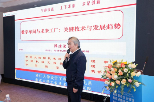 随后研讨会正式开始,中国工程院院士、机械工程专家、浙江大学求是特聘教授、浙江求是应急科技研究院学术委员会主任谭建荣带来了《数字车间与未来工厂:关键技术与发展趋势》的主题演讲。谭院士强调,从数字制造到智能制造,是制造业发展的必然趋势,也是“中国制造2025”国家战略计划的重要内容之一。其中,打造数字车间有七项关键技术:数据采集技术、数字建模技术、数字孪生技术、仿真模拟技术、工序优化技术、智能物流技术、智能硬件技术;打造未来工厂也有四大关键技术领域:智能制造技术、增材制造技术、生物制造技术、微纳制造技术。