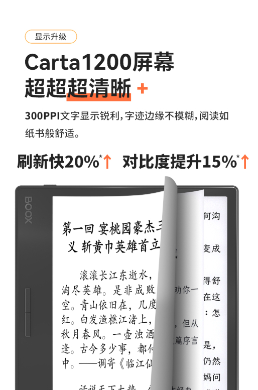 一块显而易见的好屏幕,是不可或缺的,全新发布的Leaf2搭载了300ppi超清墨水屏幕,阅读时文字锐利,显示清晰,字迹边缘不模糊。同时,采用最新Carta1200墨水屏,使刷新速度快了20%,对比度提升了15%,底色更白,阅读更自然。