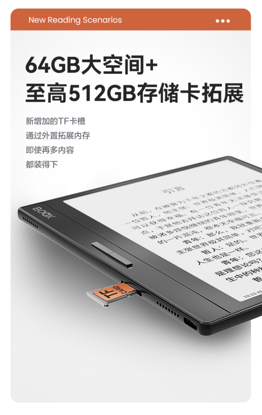 这次Leaf2给到用户的是64GB的超大存储空间,增加了外置拓展内存卡槽,至高支持512GB,这对于热爱阅读的朋友来说无疑是一个重磅福音,即便是再多的内容,在Leaf2上都能装的下。