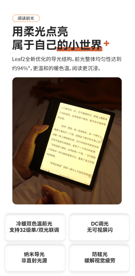 既然是为阅读而生,那么温和不刺眼的阅读灯光一定是重中之重,Leaf2的冷暖双色前光,支持32级单/双光联调,全新优化的导光解构,前光整体均匀性达到约94%,即使在夜晚弱光环境下,暖色温的前光,也能让你获得舒适的视觉阅读体验。