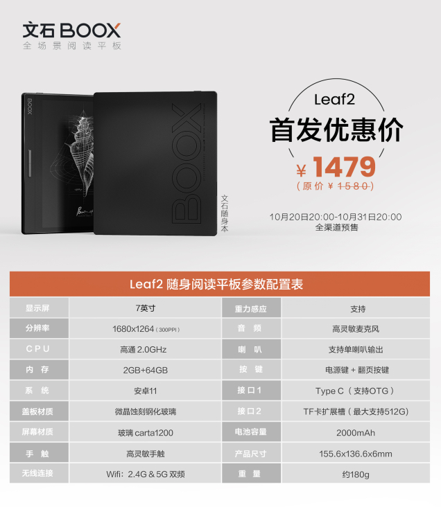 这款为阅读而生的文石BOOX Leaf2随身阅读平板,首发价格也令人惊喜,首发优惠到手价1479元,10月20日已经开启全网开启预约,可在各大电商平台搜索“文石BOOX”官方旗舰店了解详情。