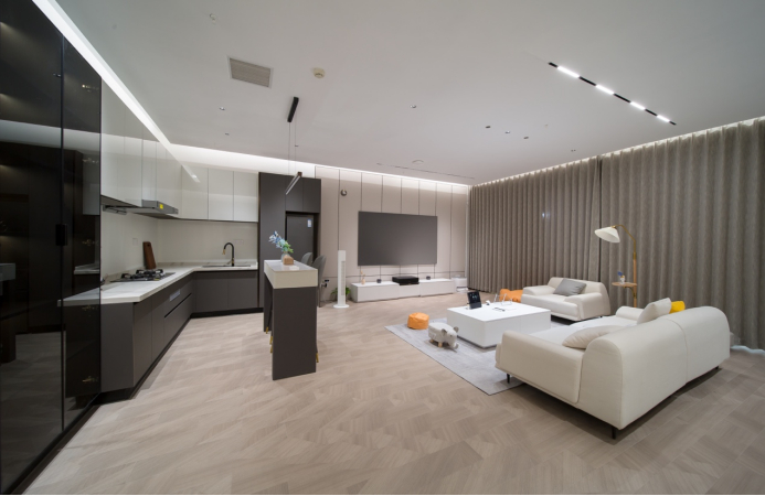 全馆空间巧妙运用了双动线设计,将智能产品展示区、全屋智能体验区、尚品宅配家装咨询区流畅地连接起来,两个出入口设置,可同时满足前装用户能从装修角度切入,智能爱好者能从智装角度切入的不同诉求;在1比1还原家空间的体验区中,厨房、客厅、书房、卧室、洗手间、衣帽间等空间场景,通过智能入户系统、智能安全系统、智能照明系统、智能控制系统等润物无声的联动设计,传达智能与家居完美融合的理念,开门回家自动亮灯自动关闭摄像机、影院模式自动匹配光线和影音、起床模式自动打开窗帘迎接阳光、家中人来设备自动感应、家中人走设备自动关闭等等智能场景,无需人为机械操作自动匹配家人需求,并可通过AI人工智能的不断学习和系统升级迭代,跟上每个家庭生活的个性化习惯和节奏。