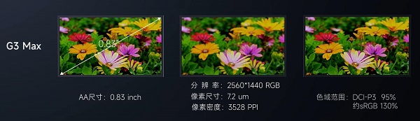 G3 Max依然以最佳观影体验为核心,相比之前20米@800吋的高清巨幕视效,FOV(视场角)大幅提升至65度,画幅较上一代提升50%,跨越式实现了IMAX级影院巨幕视效。2片2560*1440分辨率的硅基OLED屏幕,为合肥视涯最新研制,在全球目前已商业化的硅基OLED屏幕中,尺寸最大,性能最高。GOOVIS还挑战了更高难度的“全域高像质”,消除了不少头显产品边缘相质模糊的缺陷。