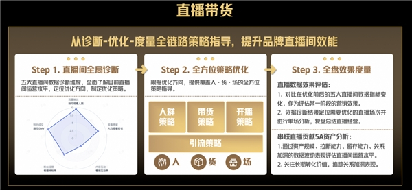 对中小商家来说,直播带货是助力生意增长的关键经营场景。为此,巨量云图极速版从“诊断——优化——度量”为商家提供直播全链路的策略指导。通过直播间全局诊断,商家可以全面了解直播间当下运营水平,找准优化方向,继而获得包括人群、货品排布、开播和引流等全方位策略指导,在直播结束后进行全盘效果度量,下钻分析单场直播表现,追踪5A资产关系变化。此外,在粉丝运营和达人营销方面,巨量云图极速版同样可以提供全链路的策略指导,助力商家成交转化提效。