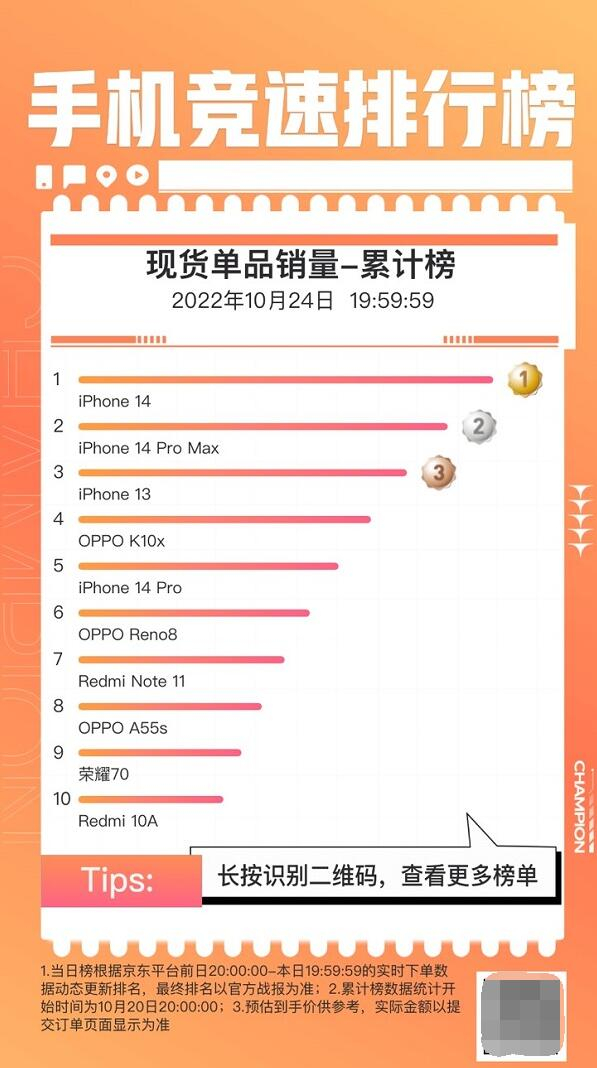 现货单品销量累计榜方面,iPhone 14、iPhone 14 Pro Max、iPhone 13、OPPO K10x、iPhone 14 Pro位列TOP5。iPhone 14占据了3款,配置方面,iPhone 14系列搭载Apple自研的A15芯片,起售价分别为6999元、5999元。Phone 14 Pro系列采用A16仿生芯片,是迄今最先进的 Pro产品阵容,起售价分别为7999元、8999元。iPhone 14 Pro和 iPhone 14 Pro Max首次采用搭载四合一像素传感器的全新4800万像素主摄,让用户在三颗固定镜头之外,还可利用新增的2倍长焦选项,影像实力更加出众。
