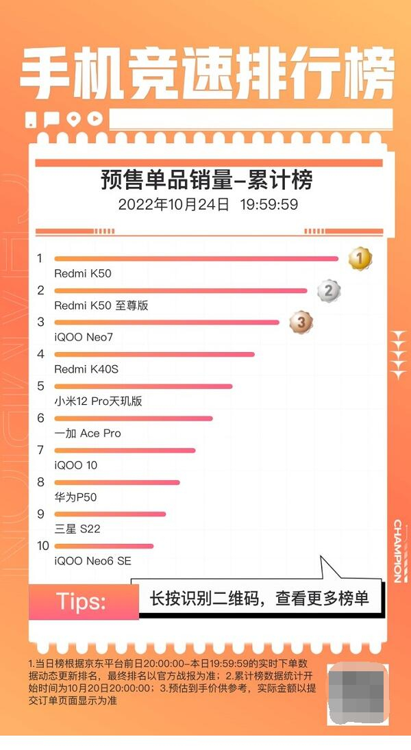 截至10月24日20点,预售单品销量累计榜方面,TOP5为Redmi K50、Redmi K50至尊版、iQOO Neo7、Redmi K40S、小米12 Pro天玑版,由此可见小米多款产品在这个11.11受到了诸多消费者的青睐。值得一提的是,Redmi K50搭载了天玑8100处理器,拥有2K柔性直屏,搭载OIS光学防抖,配备67W快充+5500mAh大电量续航配置。如果你想给自己或者父母换新一部手机,Redmi K50或许是一个不错的选择,12+256GB版本现在参与京东预售支付100元定金,尾款领券到手价2299元,支持30天价保,这个价格还是非常适合入手的。