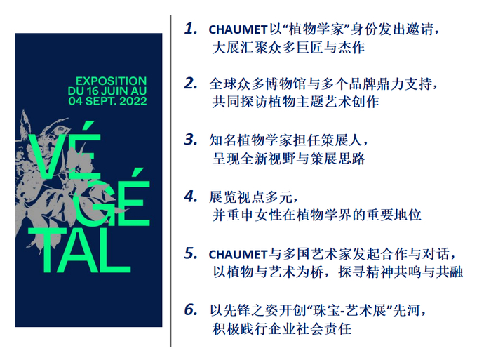 2022年6月16日至9月4日,由巴黎殿堂级珠宝艺术世家、“冠冕大师”CHAUMET尚美巴黎策划、发起并主办的“植艺万千”艺术大展,于巴黎国立高等美术学院举办。本次展览以蕴于CHAUMET植物主题珠宝作品中长达242年的“植物学家”式观察与创作方法为起点,突破传统珠宝展览框架,融合多种艺术形式,联手诸多世界顶级博物馆,在今夏为观众带来一场前所未有、近400件艺术杰作同场献映的艺术饕宴。展览由法国知名植物学家马克•让森(Marc Jeanson)担任策展人,所有展品均由其选定。“植艺万千”艺术大展不但将通过植物与艺术的崇高之美为观众带来对当下和自然的思考与启迪,亦是CHAUMET持续以先驱之姿,不断拓宽视界并持续引领时代潮流的证明。