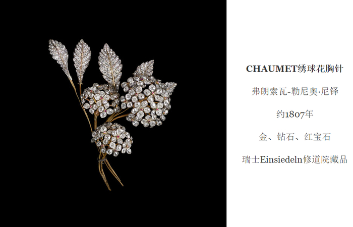 众多展品中,策展人认为最能表达此次展览主题的展品,是一件1807年CHAUMET为约瑟芬皇后之女奥坦丝王后(Queen Hortense)打造的绣球花胸针,由瑞士艾西德伦修道院特别借展。马克·让森表示:“它交叠的花叶呈现出了一种谦逊的气质,同时也忠实还原了绣球花的厚重感。不仅如此,它与CHAUMET的灵感缪斯及重要主顾约瑟芬皇后也有很深的渊源。如果你热爱植物学,那么约瑟芬皇后对你来说一定有着重要的意义。在我看来,绣球花胸针是最完整地诠释了展览主题的作品之一。”