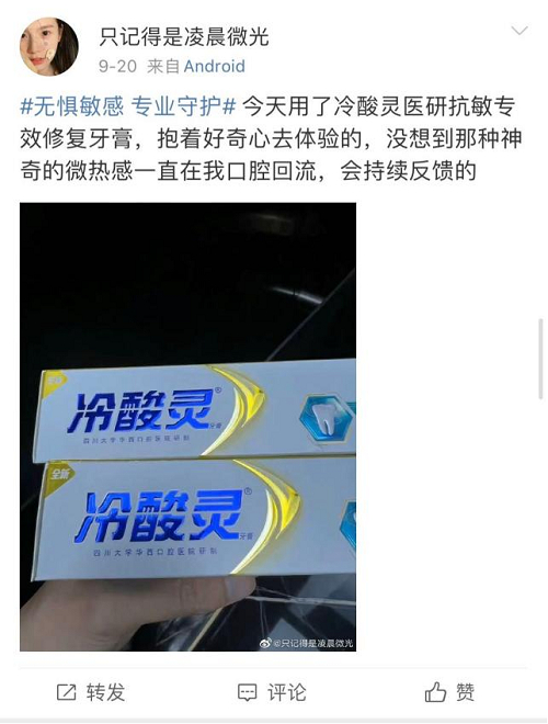 920爱牙日当天,冷酸灵官方微博联合KOL发布主题海报及直播预热海报,将爱牙日集中宣传与日常科普宣传相结合,呼吁大众形成良好的口腔健康行为,话题进一步发酵,#无惧敏感 专业守护#被顶上微博热搜榜。