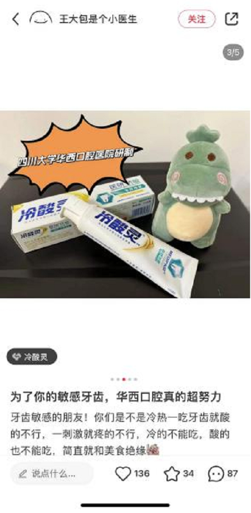 作为我国抗牙齿敏感细分市场领导品牌,冷酸灵一直将专业化作为品牌的核心价值。在专业技术研究上,登康口腔不断提升抗牙本质敏感研发技术水平,建立了行业内首家抗牙齿敏感研究中心,拥有国家级工业设计中心、CNAS国家认可实验室和重庆市“企业技术中心、工程研究中心、工程技术研究中心、工业和信息化重点实验室、工业设计中心、海智工作站、博士后科研工作站”等九大创新平台。作为中国具有影响力的专业口腔护理企业,自主研发出了冷酸灵医研®抗敏(即速60s™)牙膏和拥有国家发明专利的生物活性玻璃陶瓷冷酸灵医研®抗敏(专效修复)牙膏(专利类型:发明、专利号ZL 2013 1 0373634.7),更根据国人不同的牙敏感程度设定“RSY抗敏感推荐指数”,构建了全面多层级的专业抗牙齿敏感产品体系。在专业知识科普上,冷酸灵持续与专业口腔机构和知识平台深度合作,向消费者传播专业的口腔知识。早在2012年,冷酸灵联合中华口腔医学会、中国口腔清洁护理用品工业协会等发布了国内首部口腔健康蓝皮书——《中国口腔健康发展报告(2012)——中国人牙本质敏感现状》;2020年,再度携手中国牙病防治基金会、中国口腔清洁护理用品工业协会发布了《中国口腔健康发展报告(2019)——中国儿童口腔健康状况及对策》蓝皮书。蓝皮书的发布对口腔医学界在牙敏感方面的治疗提供了指导,研判了中国成人和儿童的口腔健康问题,提出了针对性的口腔问题解决方案,对提高口腔疾病患者的整体生活质量具有重要的指导意义,为国人口腔健康保驾护航。