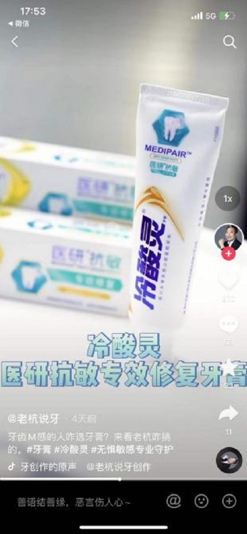 冷酸灵紧跟消费者需求,聚焦抗牙齿敏感这一差异化卖点,不断深挖消费者场景,通过抖音KOL众创引导,深奥的产品、技术、成分多维度通俗化转译,消费者专业感知,形成冷酸灵+专业抗敏的记忆反射的同时,满足公众多样化健康知识需求。