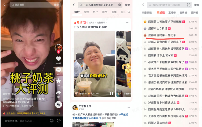 本次茶百道抖音心动新品日合作,通过平台头部达人引流,引爆一系列相关热点话题。达人张喜喜发起热点#成都降温的第一杯奶茶 同步关联商家视频,对茶百道的播放量及交易额都有产生了明显的提升作用。其中,#不炫奶茶睡不着挑战,吸引十余位个百万达人参与互动,单日视频播放量破千万;#广东人血液里流的是奶茶,9月19日登上全国热榜一位。