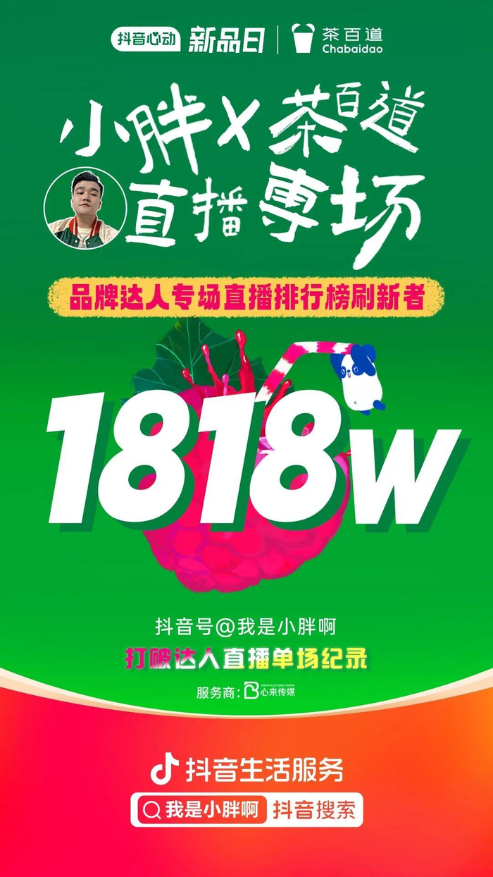 短短两周内,茶百道抖音心动新品日结合丰富的短视频+直播玩法,新品上市即引爆品牌站内热度,品牌首场达人直播达成GMV1818万,突破双日单个达人直播GMV记录,也成就了茶饮行业首个单场千万级达人直播账号。