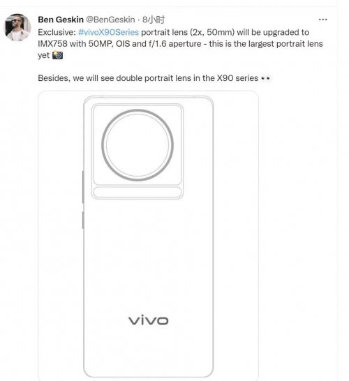 除了50mm焦段人像镜头的升级之外,最令人感到意外的应该是双焦段人像镜头组合了。根据Ben的爆料推文,vivo将在X90系列机型中同时搭载两颗不同焦段的人像镜头。笔者认为这颗镜头将会有更大的等效焦段,或将为人像特写提供更大的便利。