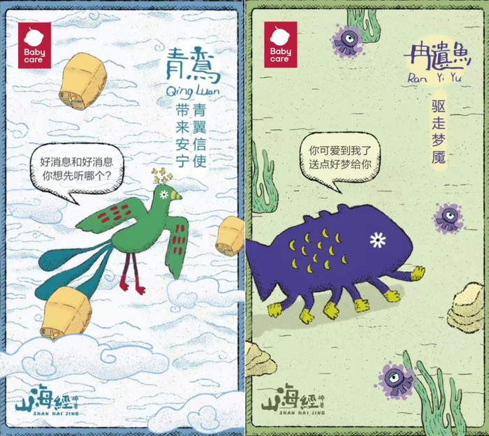 而呈现在眼前的山海神兽限定款,在经历多次打磨后保留了「朴拙」与「纯真」。相较于成年人注重逻辑的审美,Babycare更关注孩子的天性——天马行空不被束缚的想象力。为保护孩子这份珍贵的「审美」,青鸾不一定要飞上天,冉遗鱼也不一定要游回大海,让位给了如宝宝手绘般纯真质朴的画风,这正是Babycare的「为爱,重新设计」。神兽的齿轮眼睛炯炯有神,少了分“严谨”,多了分“真诚”,Babycare首席品牌官Iris告诉我们,这种“做让步”的风格,在内部被总结为“拙诚”。