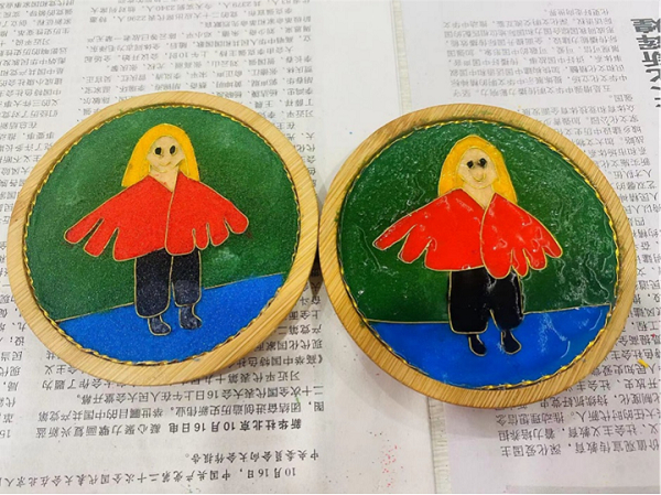 在制作杯垫之前,老师向大家分享了掐丝珐琅的历史渊源。掐丝珐琅又称景泰蓝,其工艺起源于元朝,由阿拉伯地区传入,盛行于明朝,距今已有600多年的历史。传统的掐丝珐琅工艺繁琐,制作流程也非常考究,而今天我们要做的掐丝珐琅是铜胎掐丝珐琅,已经简化了许多工艺,只需通过拓印、掐丝、点蓝最后用滴胶封层即可得到一件五彩斑斓、华丽夺目的指尖艺术品。