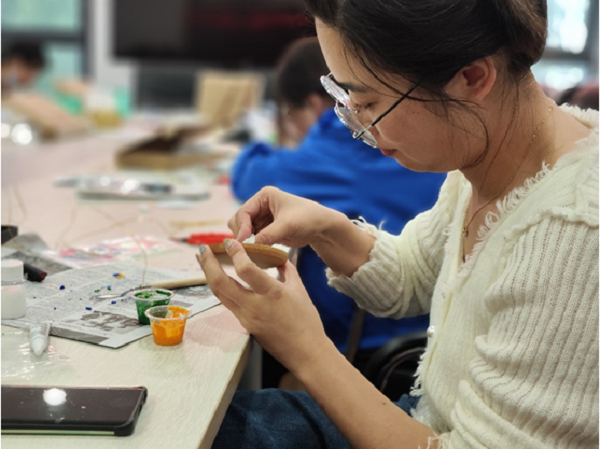 接下来便是“点蓝”,点蓝最神奇的地方在于,设计图案中并没有标注颜色,作品中花是何种色调,鸟是什么色彩,背景是涂蓝还是描绿,对比是柔和还是强烈,全在创作者的想象。凭借经验和想象选取颜色,搭配色调,手中的作品瞬间变得光彩夺目、熠熠生辉。居民们脸上露出成功的喜悦,大家互相欣赏着彼此的作品。