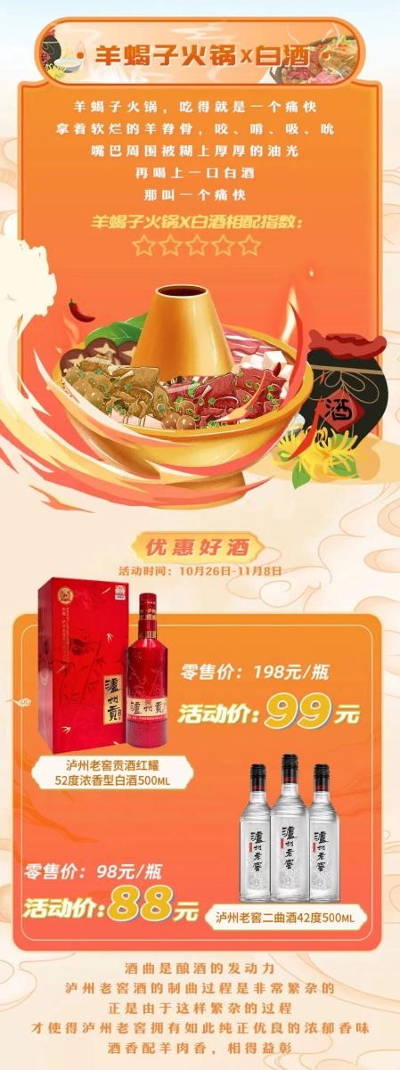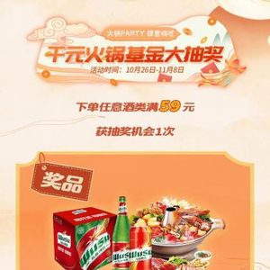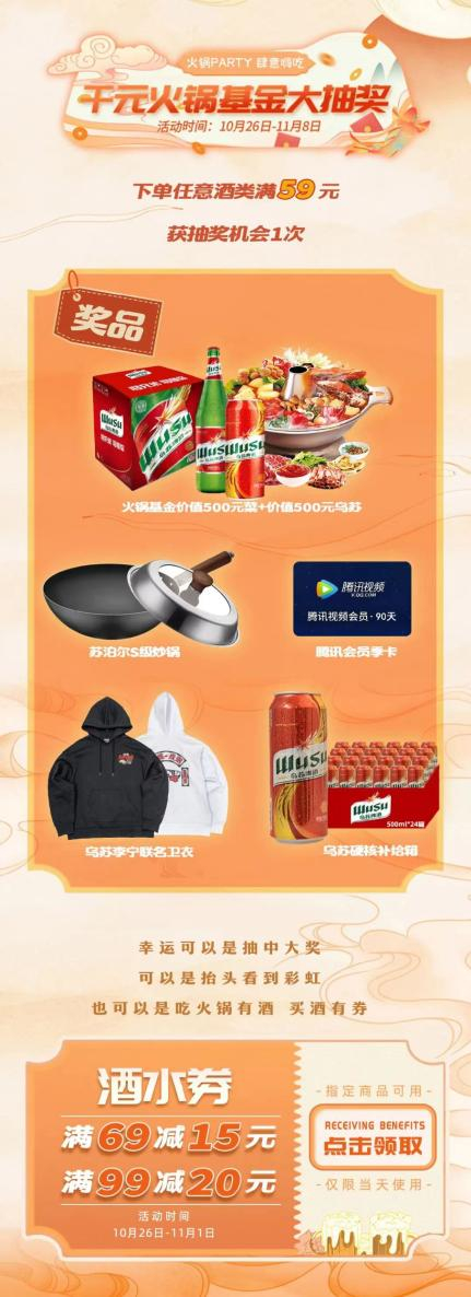 “咏悦汇酒库火锅季”特别活动之一,自10月26日至11月8日,在咏悦汇酒库下单任意酒类满59元即可获得1次抽奖机会,千元火锅基金等你来领,另外还有苏泊尔S级炒锅、腾讯会员季卡、乌苏李宁联名卫衣、乌苏硬核补给箱等超值奖品,买酒好礼送不停。特别活动之二,超级酒水券限时发放,自10月26日至11月1起,可领取满69元减15元,满99元减20元的优惠券,超过百种活动好酒,通通都放送,跟着买就够了。