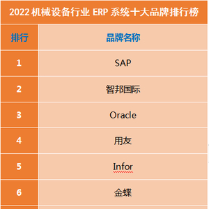 适合企业的,才是最好的。这里提供一份2022机械设备行业ERP系统十大品牌排行榜:1、SAP;2、智邦国际;3、Oracle;4、用友;5、Infor;6、金蝶;7、SAGE;8、浪潮;9、QAD;10、Microsoft。快速了解全貌,再做选择不迟。