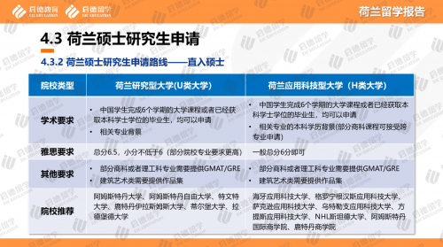 完成6个学期大学本科课程或者已获取本科学士学位的毕业生,可以申请荷兰研究型大学或应用科技型大学的硕士研究生,通常只能申请与本科学历相关的硕士课程,应用科技型大学部分商科课程可接受跨专业申请。部分商科或者理工科专业需要提供GMAT/GRE成绩,建筑艺术类需要提供作品集。在雅思成绩方面,研究型大学大多数要求总分6.5分,单科分数不低于6分;应用科技型大学要求总分6分。
