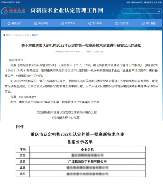 近期,重庆市2022年第一批国家高新技术企业备案公示完成,广域铭岛数字科技有限公司正式通过认定,成为国家级高新技术企业。